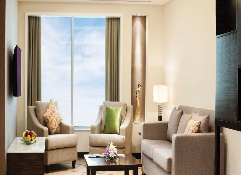 L'hôtel propose différents types de chambres et de suites. L'établissement compte 82 chambres supérieures et 275 suites spacieuses. La plupart des chambres offrent une vue imprenable sur la ville et le golfe Persique. Les chambres comprennent une baignoire profonde, une connexion Internet par câble et Wi-Fi gratuite, une télévision par satellite à écran LCD et un coin salon.