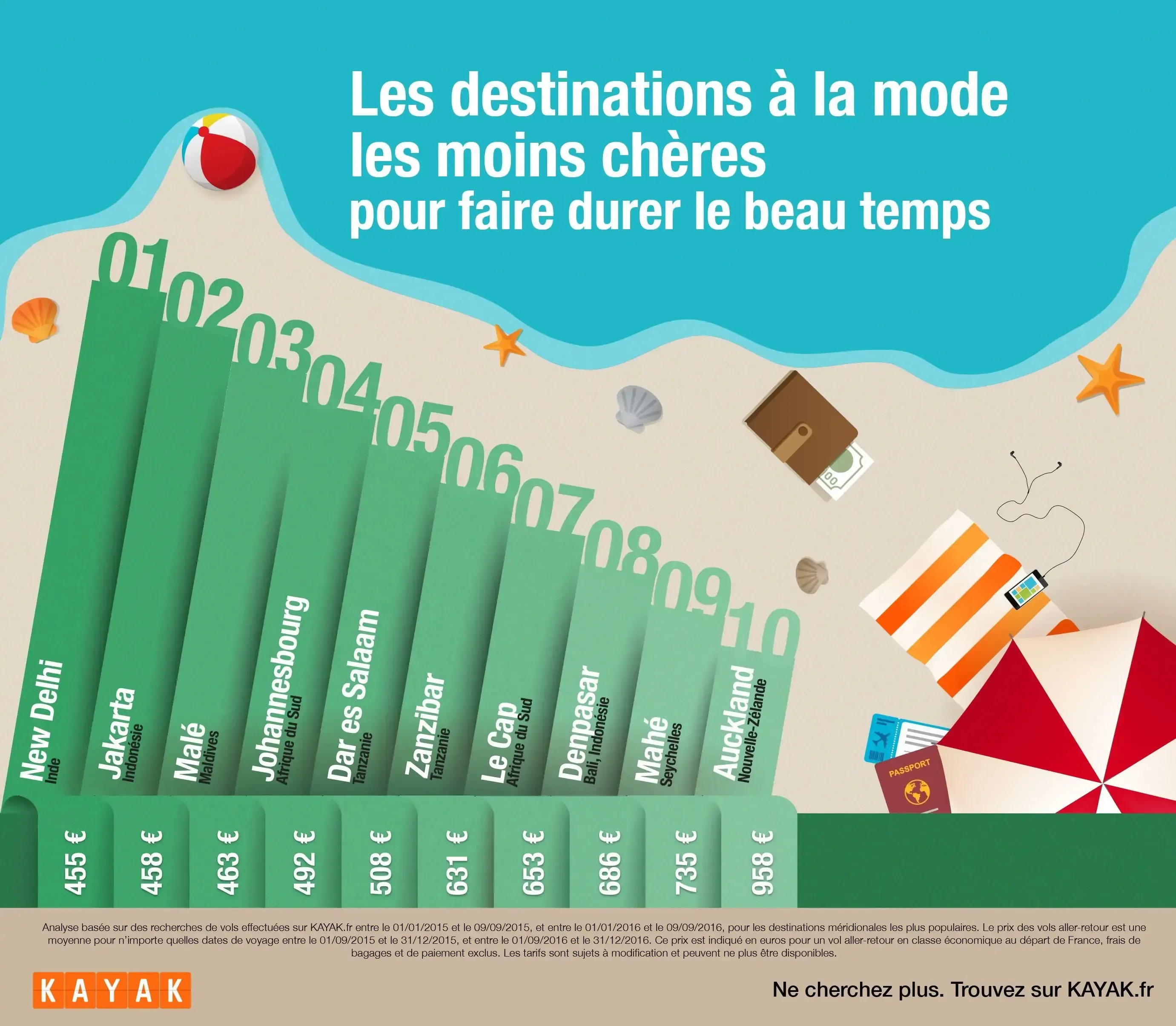 Remarque : Analyse basée sur des recherches de vols effectuées sur KAYAK.fr entre le 01/01/2015 et le 09/09/2015, et entre le 01/01/2016 et le 09/09/2016, pour les destinations méridionales les plus populaires. Le prix des vols aller-retour est une moyenne pour n’importe quelles dates de voyage entre le 01/09/2015 et le 31/12/2015, et entre le 01/09/2016 et le 31/12/2016. Ce prix est indiqué en euros pour un vol aller-retour en classe économique au départ de France, frais de bagages et de paiement exclus. Les tarifs sont sujets à modification et peuvent ne plus être disponibles.